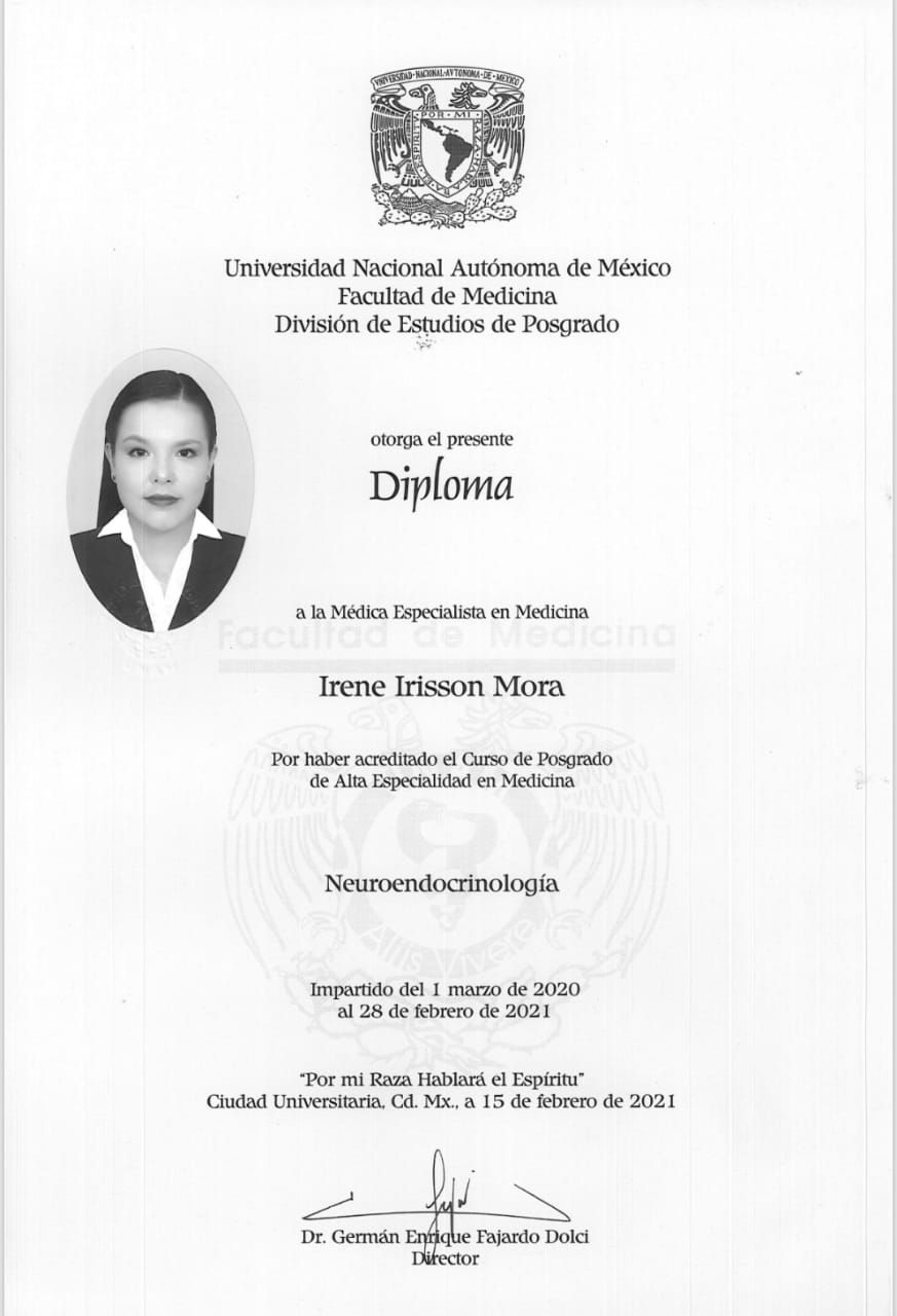 - Alta Especialidad en Neuroendocrinologia en el Instituto Nacional de Neurología y Neurocirugía, Avalada por la UNAM (2020-2021)