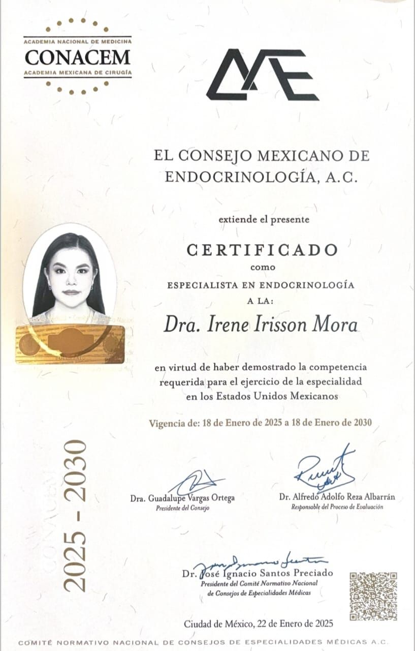 ¡Hola! Soy la Dra. Irene Irisson Mora, endocrinóloga. Me especializo en el diagnóstico y tratamiento de enfermedades relacionadas con el sistema endocrino, como la diabetes, los trastornos tiroideos y los desequilibrios hormonales. Con varios años de experiencia, me apasiona ayudar a mis pacientes a entender y manejar sus condiciones de salud. Mi enfoque es ofrecer una atención personalizada, escuchando atentamente sus preocupaciones y trabajando juntos para encontrar las mejores soluciones. Mi prioridad es que te sientas cómodo y bien informado durante cada visita. Creo firmemente en la importancia de crear un ambiente de confianza y comunicación abierta para que puedas hacer todas tus preguntas y participar activamente en tu tratamiento. Estoy aquí para apoyarte en tu camino hacia una mejor salud y bienestar. ¡Espero conocerte pronto y trabajar juntos para alcanzar tus objetivos de salud!